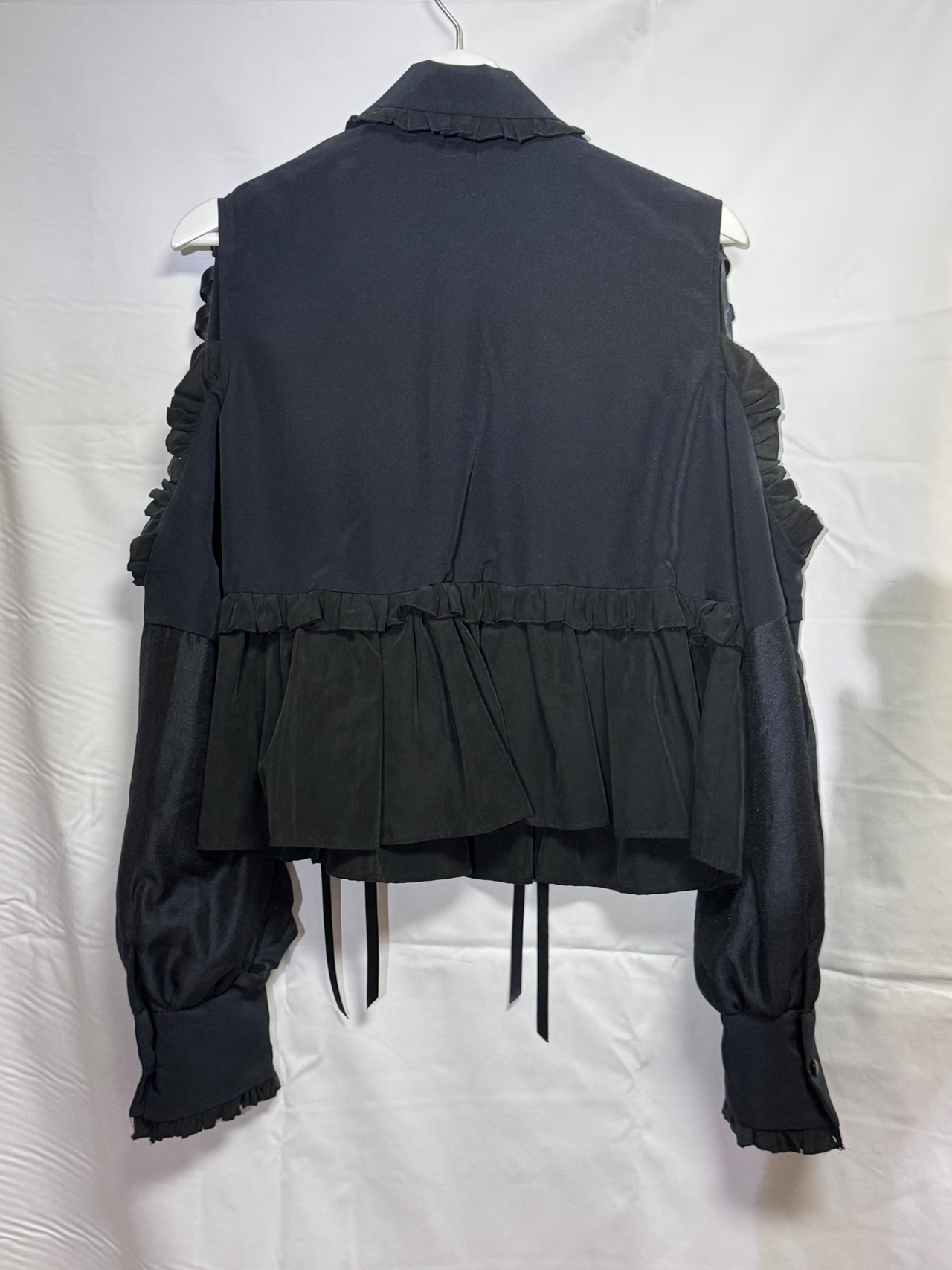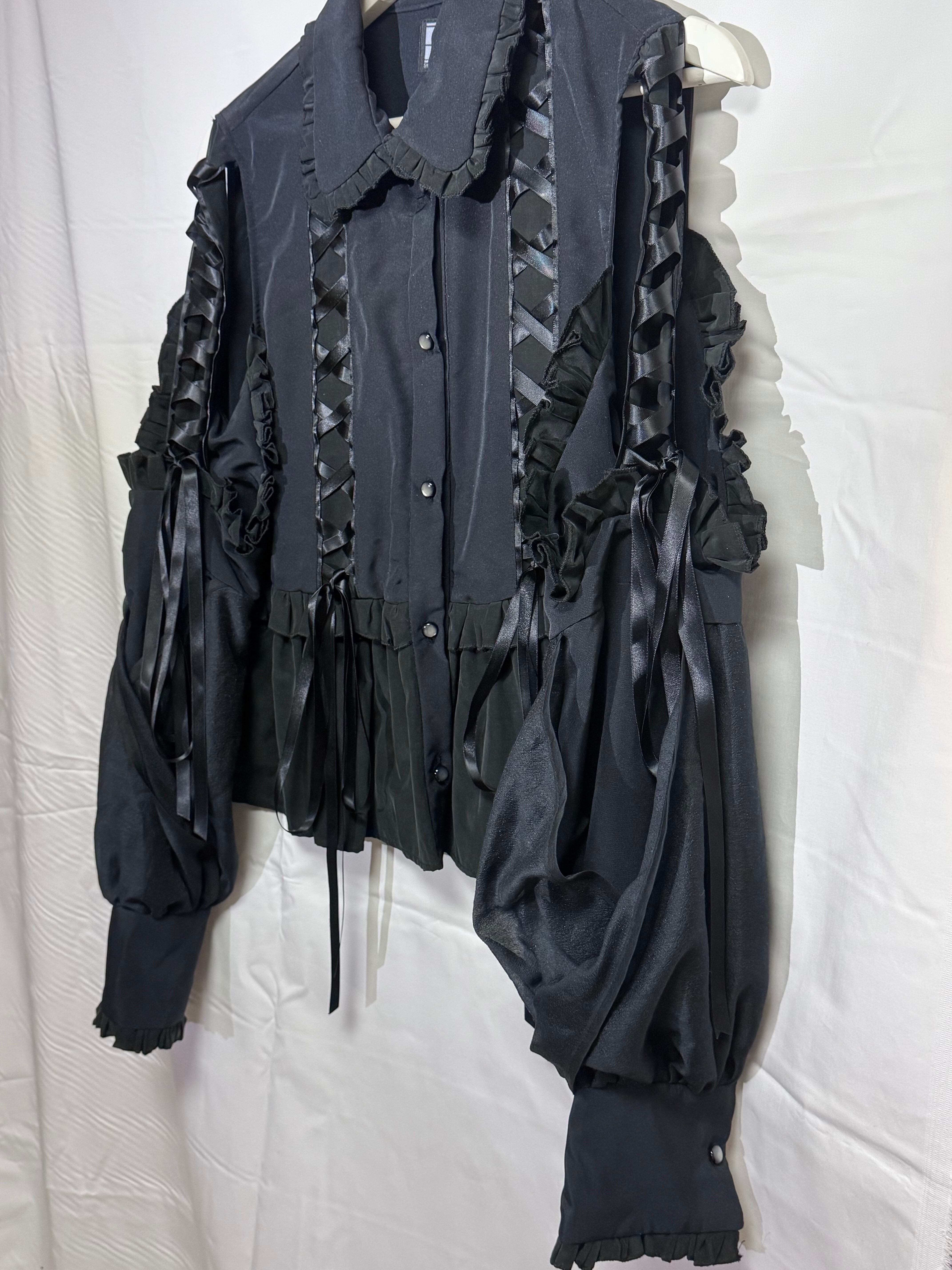 何種類かの表情の違う黒い生地にたくさんのリボンやフリルを縫い付けたシャツになります。